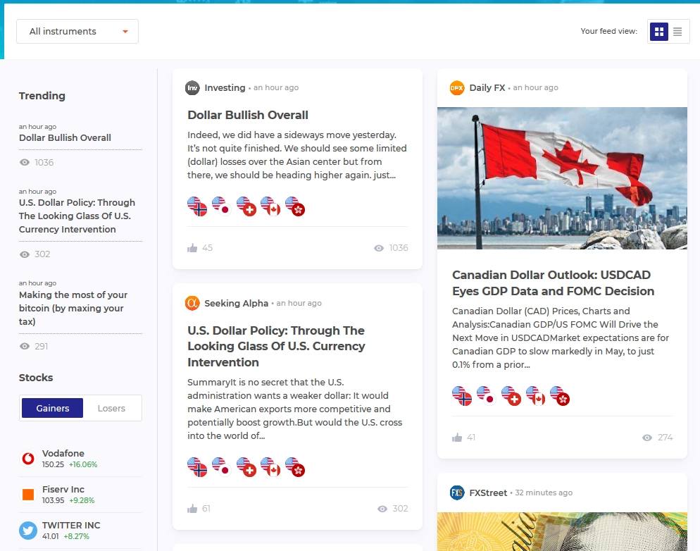 O feed de notícias exibe as últimas notícias do mercado de uma variedade de fontes diferentes. Essas notícias podem ser usadas para ajudar a encontrar oportunidades de negócios em potencial e para se manter atualizado com os últimos acontecimentos nos mercados financeiros.